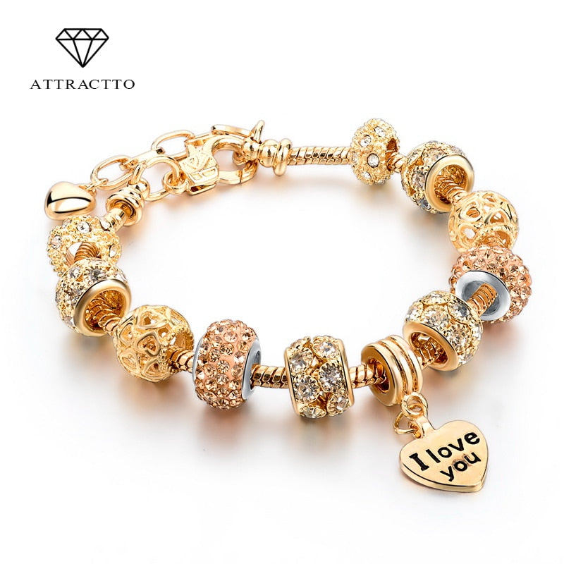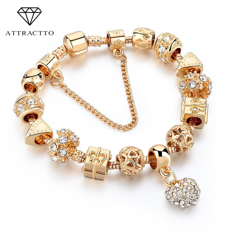 ATTRACTTO Fashion Jewelry Heart Charm Bracelets For Women Crystal Beads Gold Bracelets&Bangles For Pulseira Feminina SBR170009 (Gold)