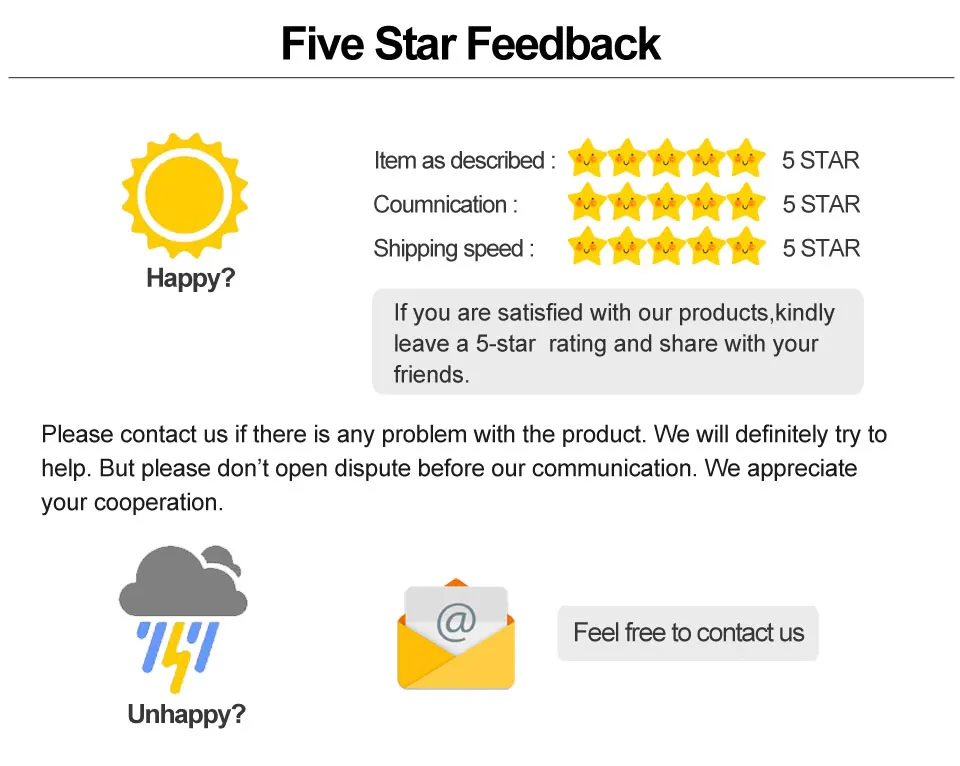 3.Disputes and review Please contact us if there is any problem with the product. We will definitely try to help. But please don't open dispute before our communication. We appreciate your cooperation.