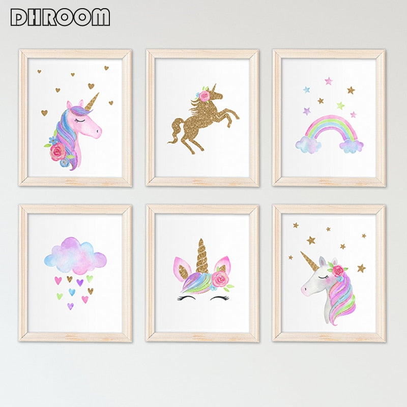 Nordic Unicorn Wall Art Gold Glitter Prints Pink Nursery Cloud Rainbow Canvas Poster Painting Wall Picture Kids Room Decor