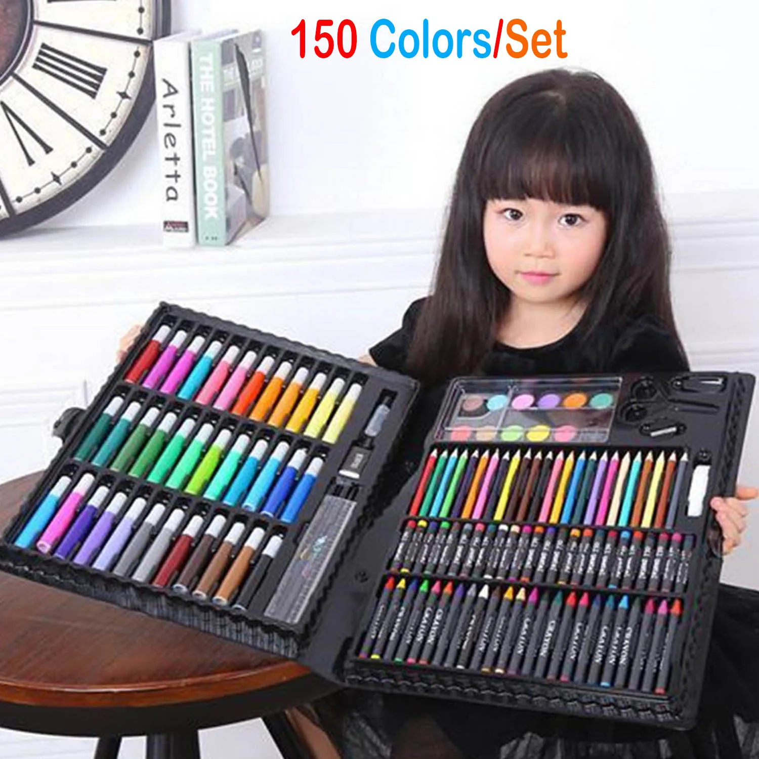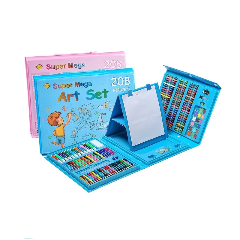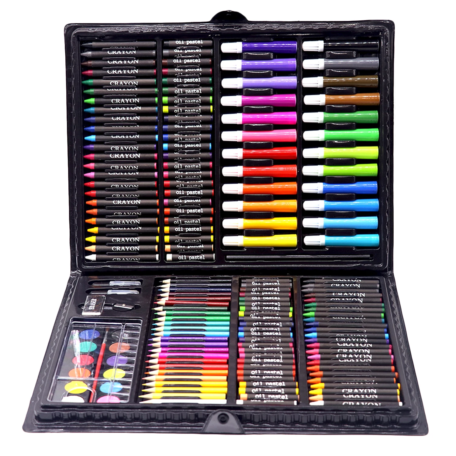 Set includes 48 crayons,48 oil pastels, 24 markers, 24 mini color pencils, 12 watercolor cakes, 6 plastic clips, 1 pencil sharpener, 1 plastic palette, 1 eraser, 1 paint, 1 glue and 1 HB pencil, total 168pcs.